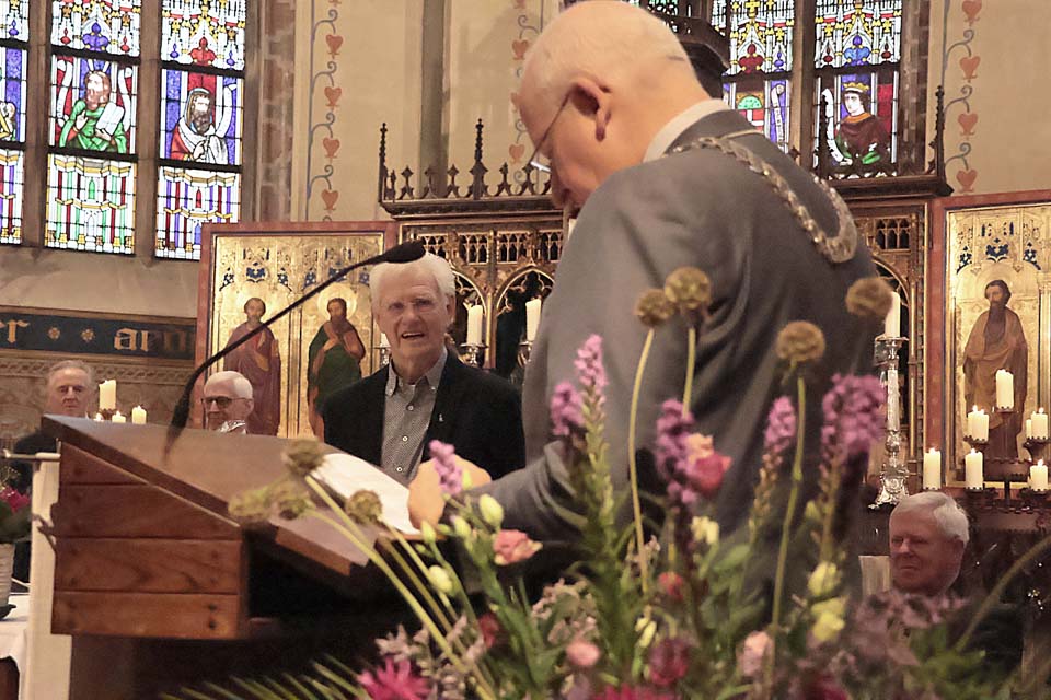 Vandaag ben ik hier om één van jullie leden in het bijzonder in het zonnetje te zetten. Het is iemand wiens prachtige stem al meer dan 30 jaar in de Simon en Judaskerk klinkt. Meneer Gerard ten Elsen, zou u naar voren willen komen?