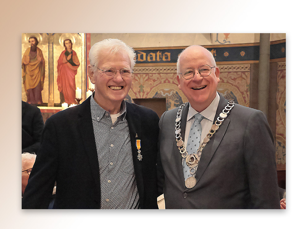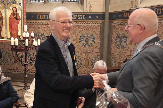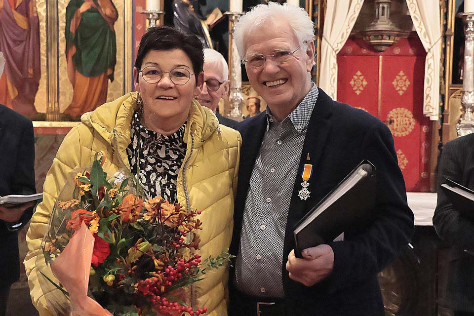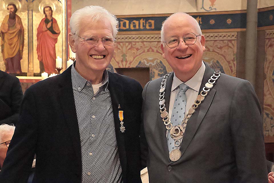 Het leek voor Gerard ten Elsen een gewone zondag te worden. Voor de dienst van 9.00 uur nog even inzingen en daarna mooie Gregoriaanse liederen tijdens de viering ten gehore te brengen. Gerard geniet er al meer dan dertig jaar van om lid te zijn van dit Herenkoor. Na afloop van de viering werd het koor verzocht om allemaal naar voren te komen. Deze zondag stond in het teken van St. Caecilia, dus zullen er één of meerdere leden gehuldigd worden. Dat klopte ook, want Fons Olde Dubbelink ontving een insigne en oorkonde, omdat hij maar liefst 65 jaar lid was van een herenkoor binnen Lumen Christi. Daarna kwam burgemeester John Joosten naar voren en dat gaf toch wel binnen het koor de nodige kriebels. De burgervader maakte aan alle onzekerheid een einde door Gerard ten Elsen naar voren te roepen en hem toe te spreken. Zo even nog lid van het herenkoor en na de speech van de burgemeester Lid in de Orde van Oranje Nassau. Eén ding is zeker hij blijft een trouw lid van het Herenkoor en is trots op zijn lintje.