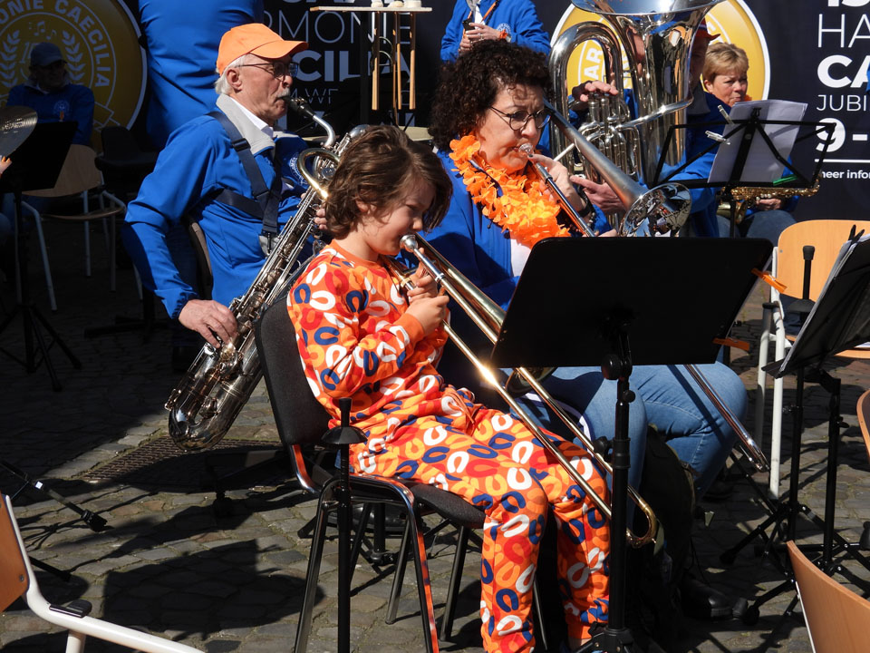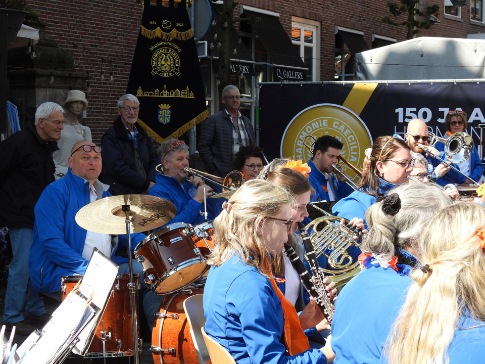 Op de Markt was het muzikaal genieten van het concert van harmonie Caecilia. In eerste instantie speelde het jeugdorkest ‘De Notenkrakers’ een aantal nummers. Daarna was het de beurt aan de harmonie, die traditiegetrouw hun concert begonnen met het spelen van het Wilhelmus. De nationale hymne werd gevolgd door een aantal prachtige bijdrages van het muziekkorps. Ook de slagwerkgroep liet zich niet onbetuigd en wist regelmatig de handen op elkaar te krijgen.