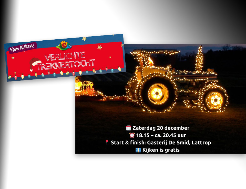 Zaterdagavond 20 december vindt deze plaats. Traditiegetrouw start de optocht bij Gasterij de Smid in Lattrop. De route voert via Noord-Deurningen naar Denekamp. Vervolgens via Tilligte en de Dusinksweg richting Agelo. Bij de Amanshoeve slaan ze rechtsaf om dus via Agelo naar Reutum te rijden. Via de Almelosestraat en de Rondweg trekken ze door Ootmarsum om op de rotonde linksaf de Laagsestraat in te rijden. Via de Ottershagenweg rijdt het verlichte spektakel weer naar het startpunt in Lattrop en dat is dus bij de Gasterij. Naar verwachting rijden er zo’n vijftig tot zestig trekkers en andere voertuigen mee. De start is om 18.15 uur. Voor Ootmarsummers is de verwachting dat de optocht rond 19.15 uur op de Dusinksweg rijdt en tegen 20.15 uur op de Almelosestraat en de Rondweg.