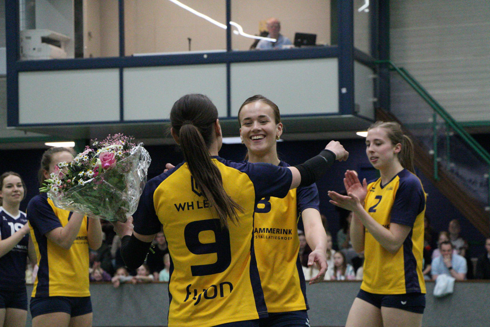 Alle vijf ontvingen ze, namens de hele selectie, een karakteristieke foto en een bos bloemen. Van het publiek kregen ze een meer dan waarderend applaus voor hun inzet voor dames 1 en de toch ook mooie wedstrijden, die ze in sporthal de Schalm hebben laten zien.