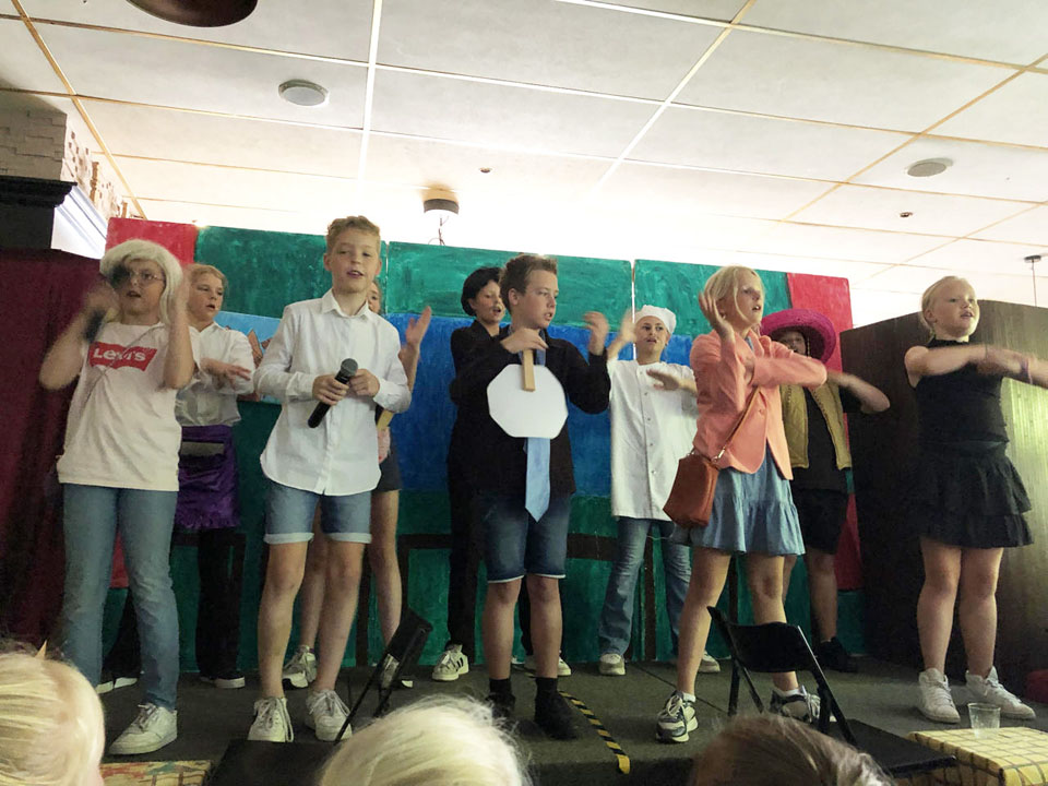 Op donderdag 11 juli werd de musical twee keer opgevoerd in de ‘theaterzaal’ van café restaurant ‘Max Groot Agelo’. ’s Middags voor de leerlingen van groep 1 t/m 6 en ’s avonds voor familieleden van de spelers.