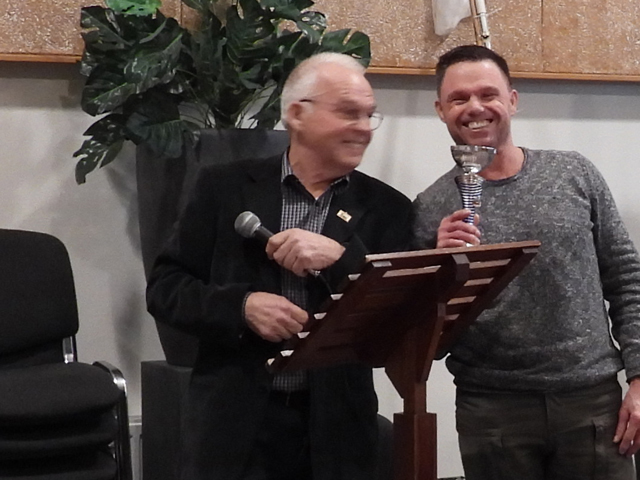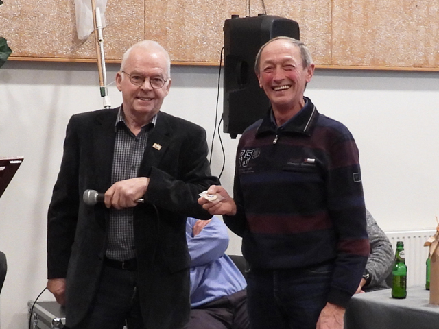 De voorzitter liet vervolgens het licht schijnen op twee jubilarissen, die 25 jaar lang deel uitmaakten van de vereniging. Harrie Kokkelink en Herman Bolscher kregen het welverdiende speldje voor hun zilveren lidmaatschap. “Harrie Kokkelink is voor ons, voor en na de tentoonstelling, een belangrijke vrijwilliger. Hij helpt mee met de opbouw, verzorgt de catering en is ook als laatste betrokken bij het opruimen om met een goed gevoel Het Damast te verlaten. Herman Bolscher kennen we als een fanatiek kweker van grasparkieten, maar daar lijkt een einde aan te komen, want nu is zijn hobby toch paarden geworden. Dat neemt niet weg dat hij een zeer gewaardeerd lid is van onze vereniging.”
