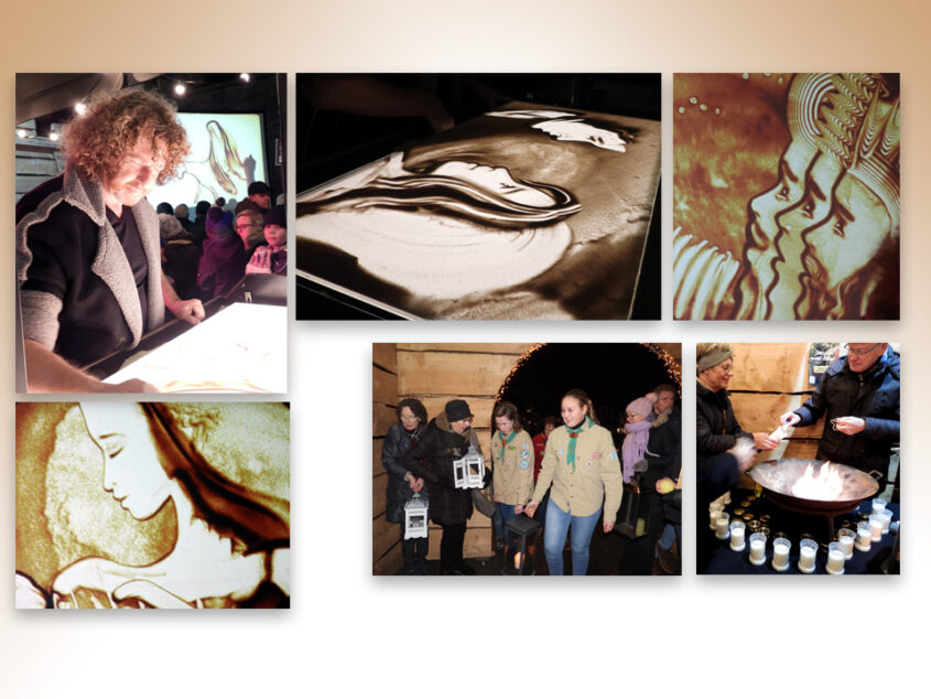 Beter bekend als de ‘Zandtovenaar’. Ademloos keken jong en oud toe hoe de zandkunstenaar het Kerstverhaal uitbeeldde.