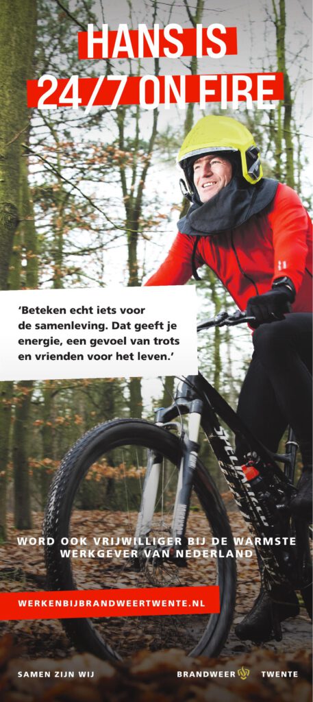 In verband met COVID-19 is dit jaar de campagne voornamelijk online. De campagne richt zich ook op de doelgroep flexwerkers, mensen die voor hun werk niet gebonden zijn aan een vaste werkplek. We bieden hen gratis werkplekken met voorzieningen aan. Belangstellenden zijn verbonden aan een kazerne en zijn onderdeel van het lokale team. De flexwerker is gemiddeld twee dagen in de week in de kazerne en rukt bij een alarmering uit. We maken het graag mogelijk, hoe past Brandweer Twente in jouw wereld?