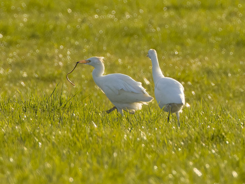 Van oorsprong is de koereiger een vogel, die uit Afrika komt. Al decennialang is deze kleine reigerachtige te bewonderen in Zuid Europa. Deze koereiger is het minst aan water gebonden. Het liefst lopen ze in weilanden tussen de koeien of schapen. In 2023 hebben er 5 paar in Nederland gebroed. In 2024 al 31 paar. Het lijkt erop dat deze soort zich als broedvogel helemaal thuis gaat vinden. Momenteel voelen ze zich ook helemaal thuis in het weilandje aan de Denekamperstraat. Ze zijn hier al 3 dagen te bewonderen. Waarschijnlijk zullen ze over niet al te lange tijd vertrekken richting de kop van Overijssel waar ze in de Wieden/Weerribben broeden.